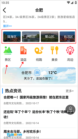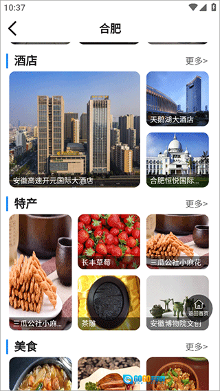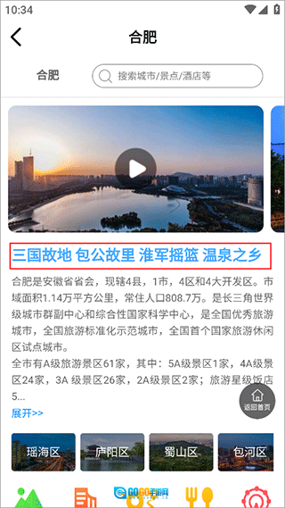 3、映入眼帘的是合肥的详尽介绍,向左滑动可看到合肥的风景照片。
