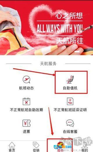 1、第一步,在手机上安装天津航空软件。安装完成后,打开客户端,接着点击“服务”,随后点击“自助值机”选项。