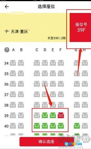 5、接下来的页面会呈现选择座位的列表,我们从中挑选自己想乘坐的位置,接着点击“确认选座”图标。