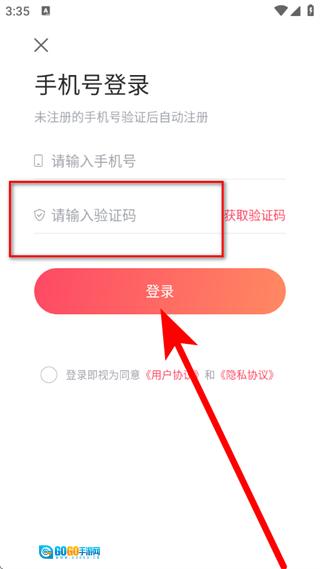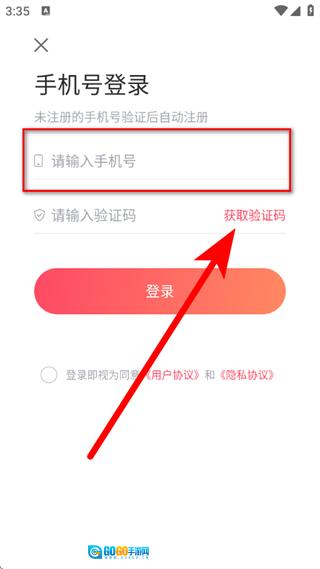 3、来到登录页面,填入手机号后,点击“获取验证码”。