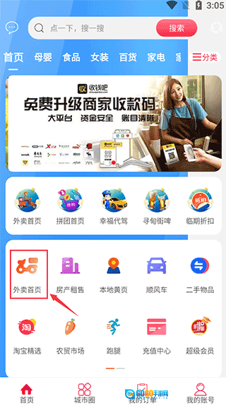 1、首先在本站安装好后,进入到主页面,可以在许多功能中看到首页外卖,我们点击进去。