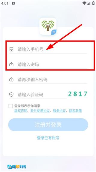 2. 在注册页面,填入手机号与密码,接着进入下一步。