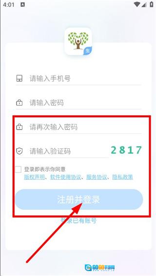 3、重新输入密码,填入验证码,点击“注册并登录”,完成注册登录流程。