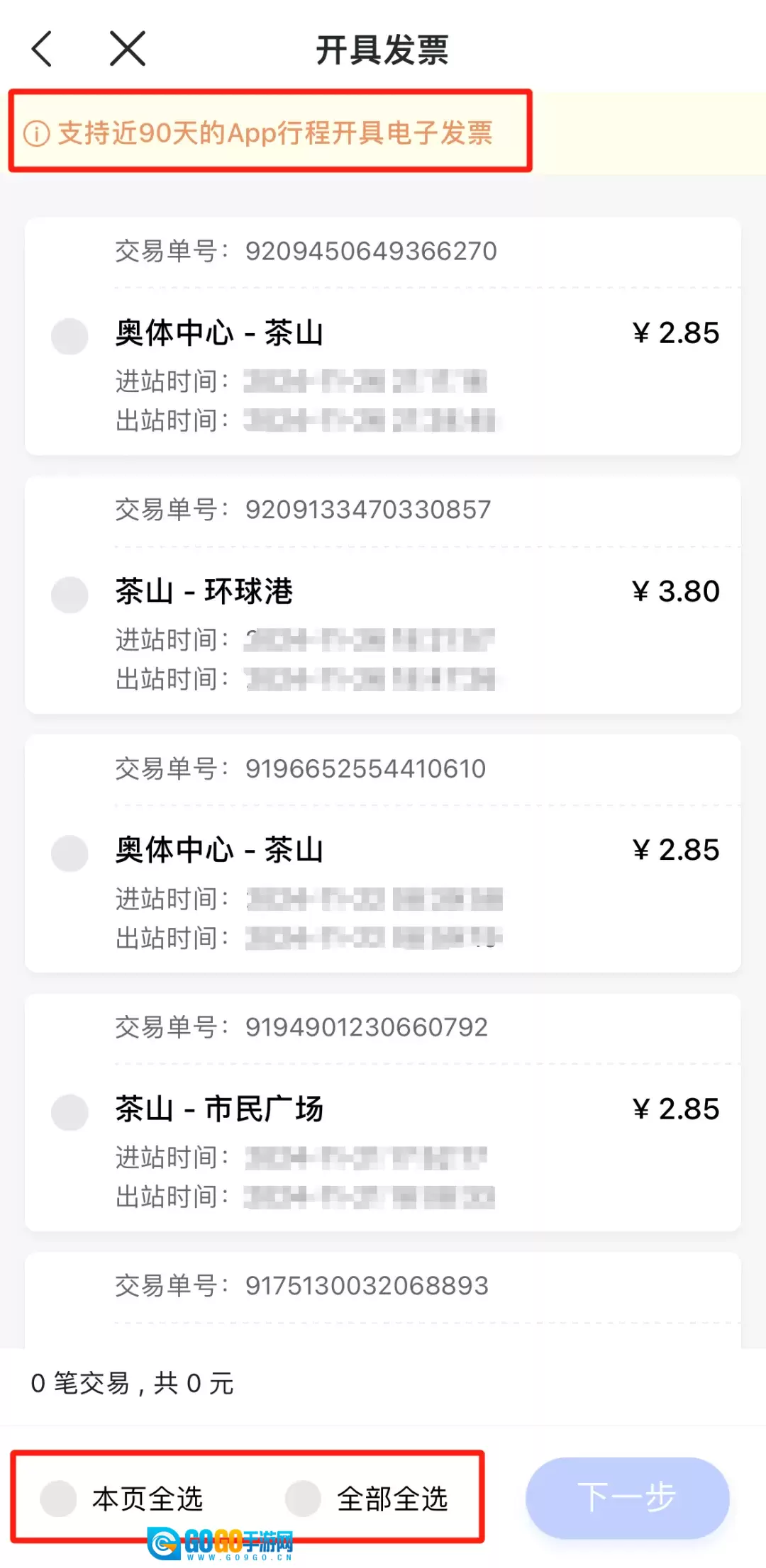 3. 勾选需要开票的行程,可同时勾选多个行程,也能在页面左下角进行批量开具。注意:常州地铁App仅支持对90天内的行程开具电子发票。