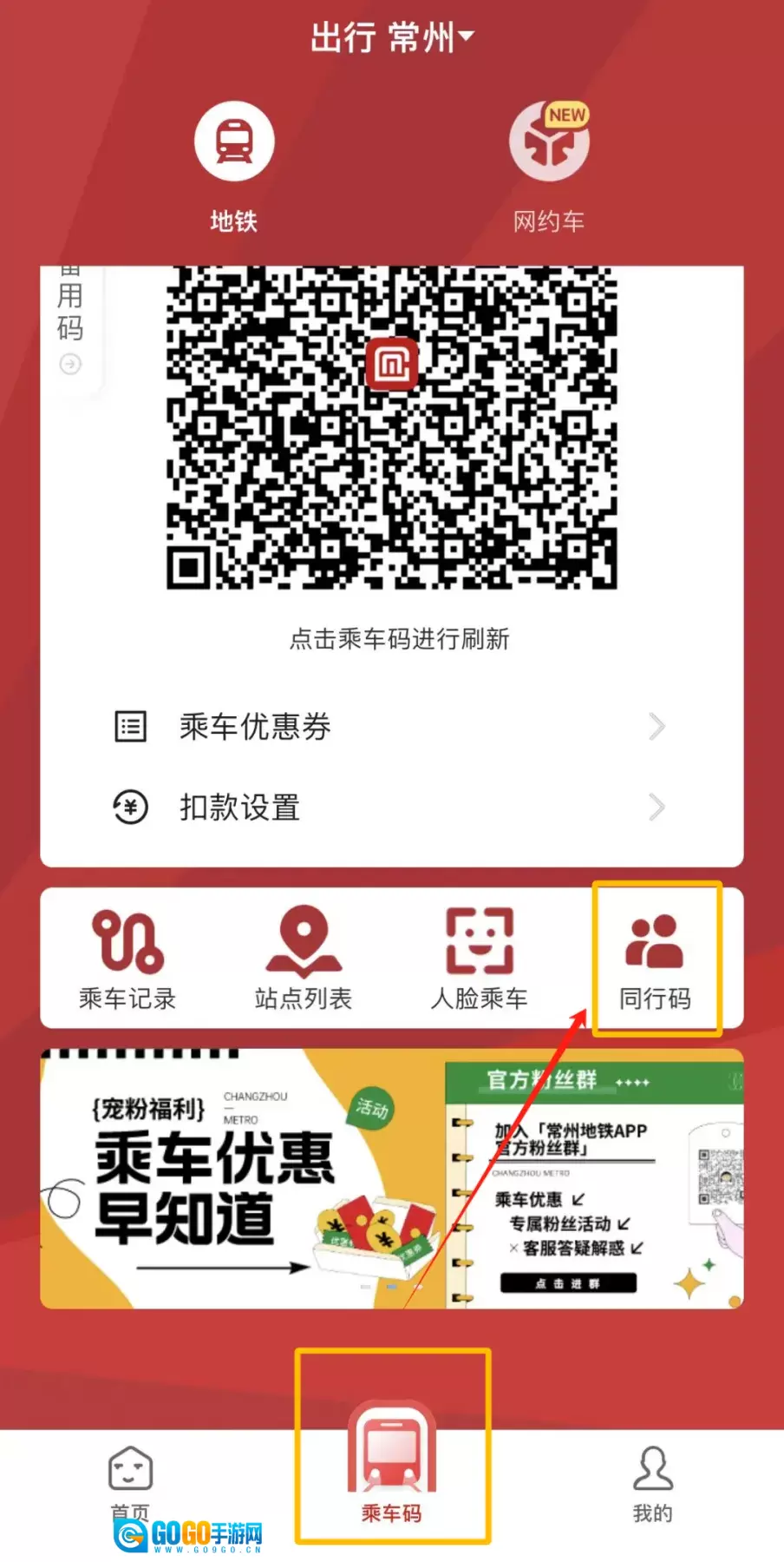 6. 乘客若要开通同行人脸,务必先开通【同行码】功能,具体操作为在【乘车码】页面右下角点击【同行码】。