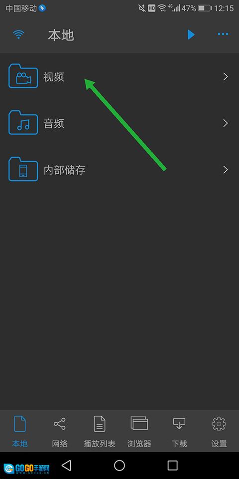 1、打开,进入【本地】页面中点击【视频】(下图绿色箭头所指区域)