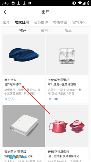 2. 在居家日用类的推荐商品里,点击【魔态坐垫】,即可进入该商品的详情页面。