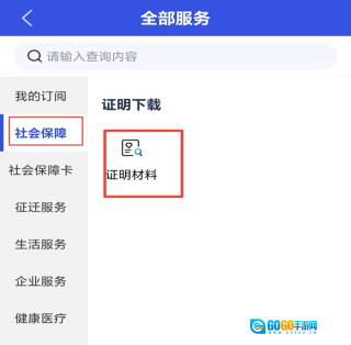 2.选择“社会保障”,下滑找到“证明”模块,点击“证明材料”。