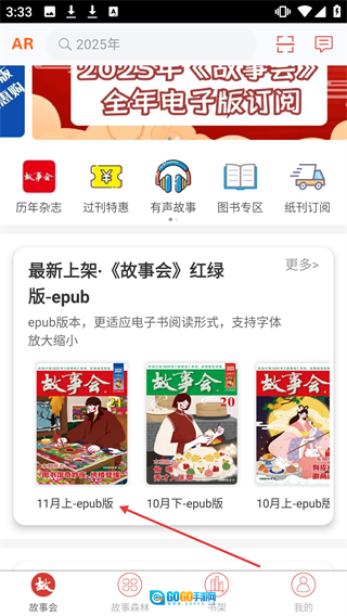 1. 在应用的首页,寻觅到【最新上架・《故事会》红绿版 - epub】这一区域,而后点击【11 月上 - epub 版】,从而进入详情页面。