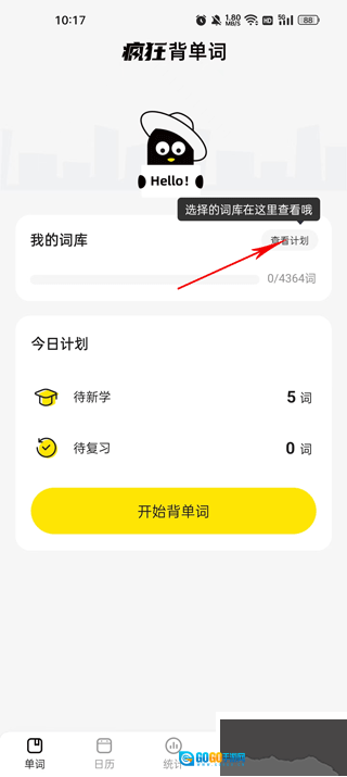 1、词库进入步骤:开启软件后,于首页查看计划,随后进入我的词库页面。