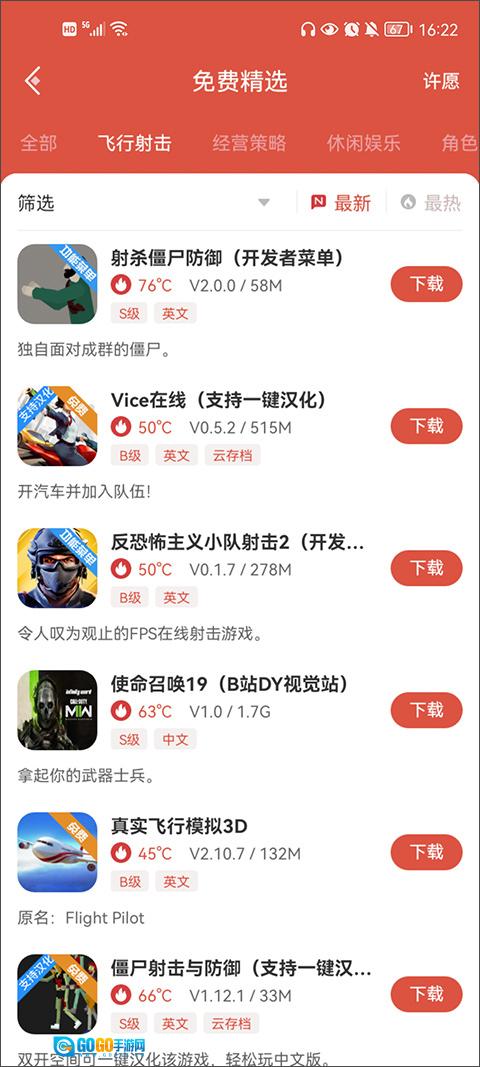 3、小编挑选的是飞行射击类别,下方栏目里带有蓝色条幅的便是功能资源。