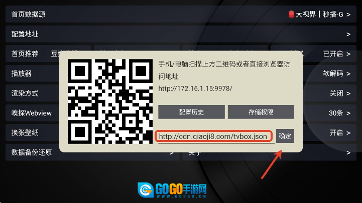 3、复制上方提供的接口,点击确定,随后重新启动即可(推荐:http://cdn.qiaoji8.com/tvbox.json )