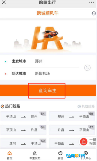 2、操作步骤如下:点击“我要出行”,接着输入行程的起止地点,最后查询车主。