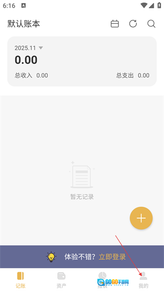 1. 进入老板记账,就能查看默认账本的收支状况,点击底部的【我的】,即可进入个人页面。