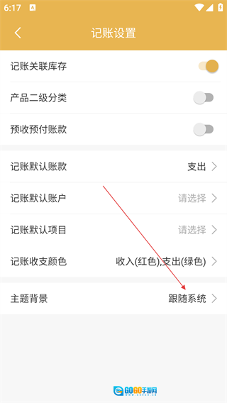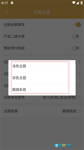 3、于记账设置界面,能够对记账关联库存、产品二级分类等功能进行设置。点击【主题背景】,可在浅色主题、深色主题以及跟随系统模式中进行选择。