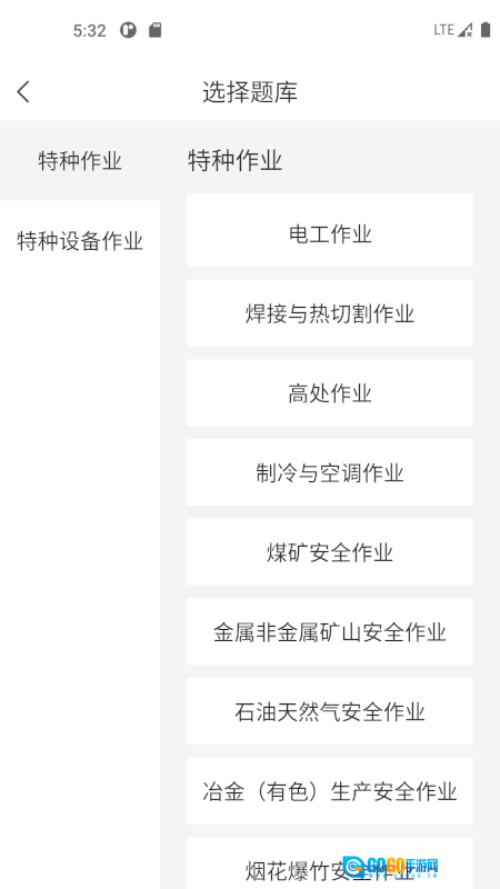 2. 来到题库练习页面,查看特种作业类型的清单,挑选自己需要复习的领域。