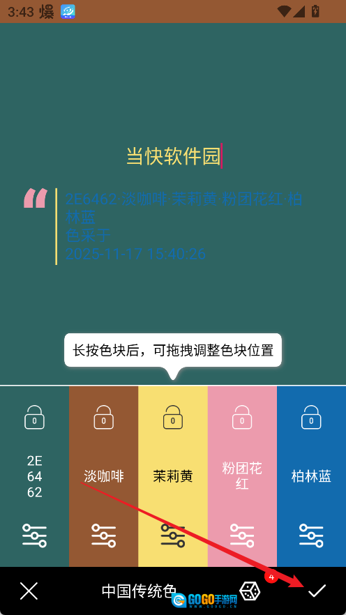 4、完成配色后,长按色块就能通过拖拽来调整其位置,最后点击右下角的“√”,便可完成保存。