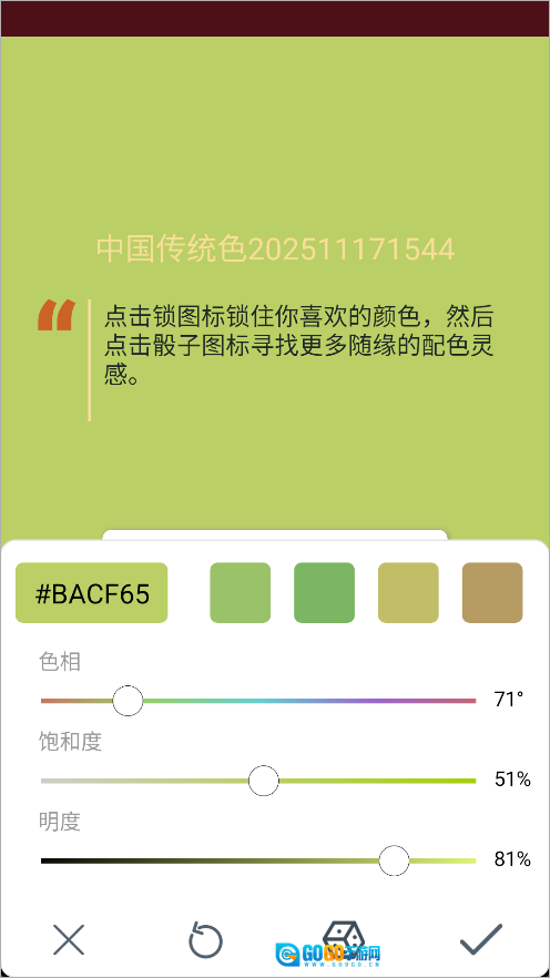 3、取色界面独具匠心地设计了锁定和随机取色机制,助力你更为轻松地搭配出美观的配色。