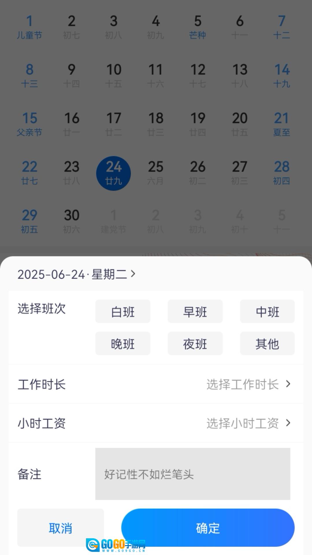 2. 在新增的页面里,挑选班次、工作时长、小时工资以及填写备注,接着点击确认,就能完成工时添加。