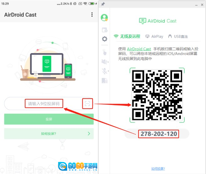 需要将电脑上的投屏码输入到您的 Android 设备,连接两台设备并启动投屏请求。也可以扫描二维码以建立设备之间的连接。