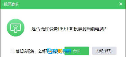 在手机上发起投屏后,电脑上就会出现一个投屏请求窗口“是否允许设备 xxx 投屏到当前电脑?” 。请单击允许接受请求。出现提示时,如果您不希望每次都出现请求,请选中“信任该设备,之后不再询问”