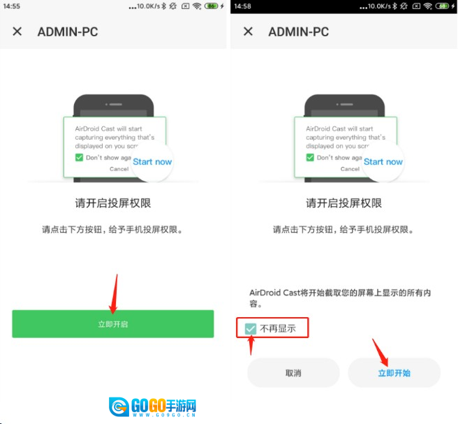 接受电脑的投屏请求后,Android 设备上会弹出投屏权限页面和窗口“AirDroid Cast将开始截取您的屏幕上显示的所有内容”。请点击“立即开始”并根据提示进行授权。