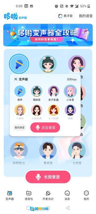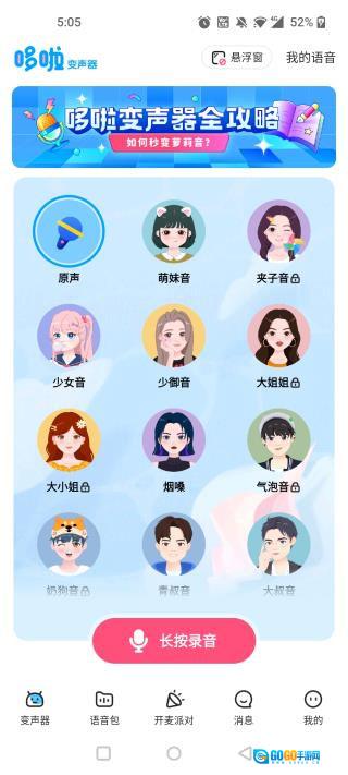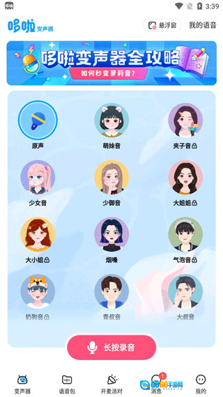1、进入哆啦变声器,在变声器页面中拥有超多仿真网红音色随你选择,选择你要的音色,通过长按即可录音;