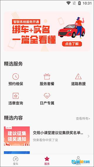 4、切换至“服务”栏目,此栏目支持预约保修、服务套餐选择、道路救援以及违章查询等功能。