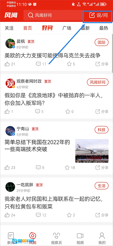 1. 打开应用,在风闻界面的右上角找到并点击说/问功能。