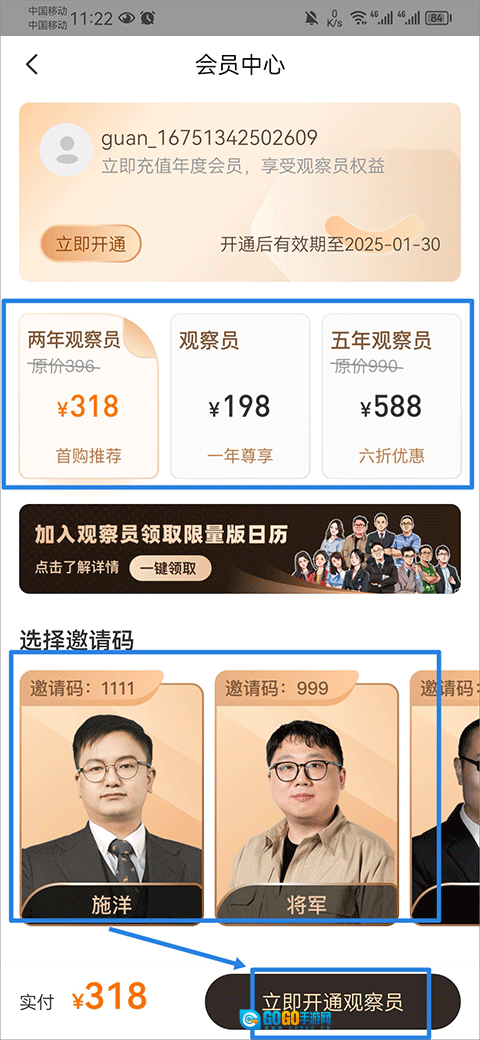 2、进入之后,依据自身需求完成开通操作,即可成为观察员。此外,选择邀请码还能为你提供一定金额的优惠。