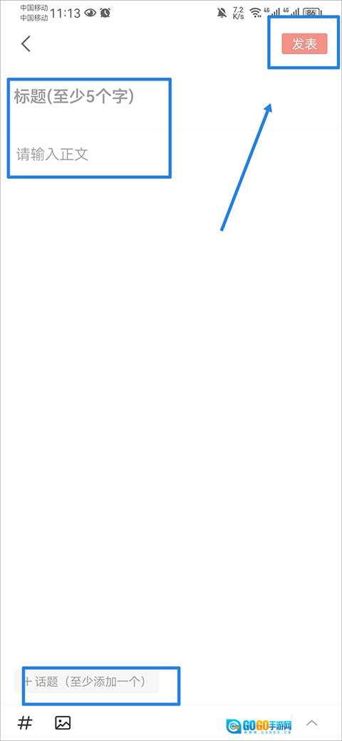 2、进入页面后,完成文章标题与正文的编辑,接着挑选一个话题,然后点击右上角的“发表”按钮即可。