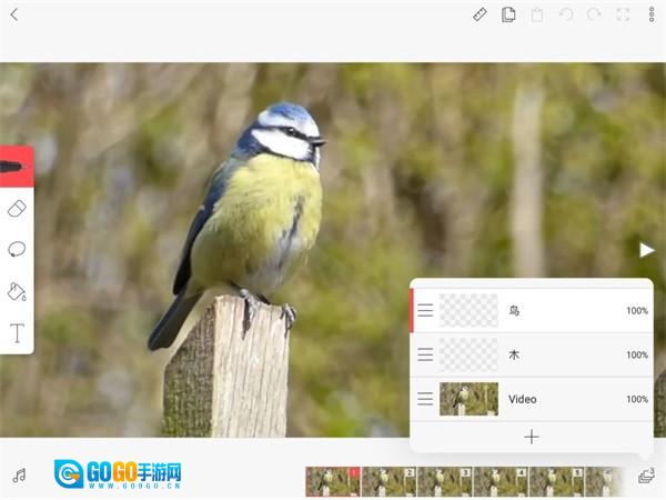 点击右侧的图层图标,可以看到图层图标,里面有视频的图层,我们可以把视频上方的空白图层命名为树,然后再建一个新图层并命名为鸟,拖动图层可以上下移动。