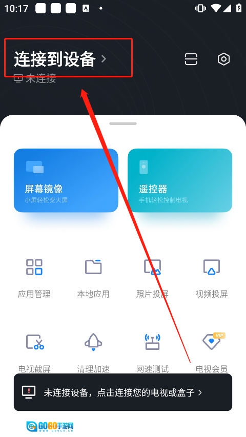 1、首次进入时,在进行投屏操作前,我们需先建立电视与手机设备之间的连接。在如下图所示的位置,点击“连接到设备”,以添加个人的电视设备。