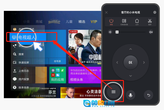 1. 打开小米电视或盒子的首页,按下【遥控器菜单键】,然后在选项中选择【小米电视助手】。