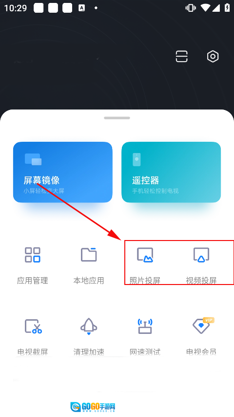 4、当与电视成功连接后,回到软件主页,点击其中的照片或视频投屏选项,就能把手机上的画面投屏到电视机上。