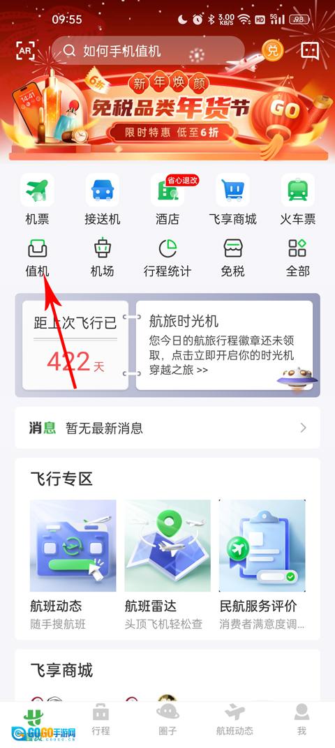 1. 用户开启软件后,于首页机票下方寻得值机入口,点击该入口进入值机板块。