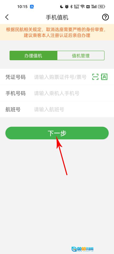 2、进入手机值机办理板块,填写购票证件号或票号、乘机人手机号码、航班号,然后选择下一步。