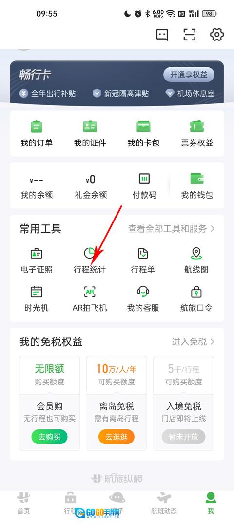 2、进入我的页面后,在页面中间的常用工具里找到行程统计,点击即可进入。
