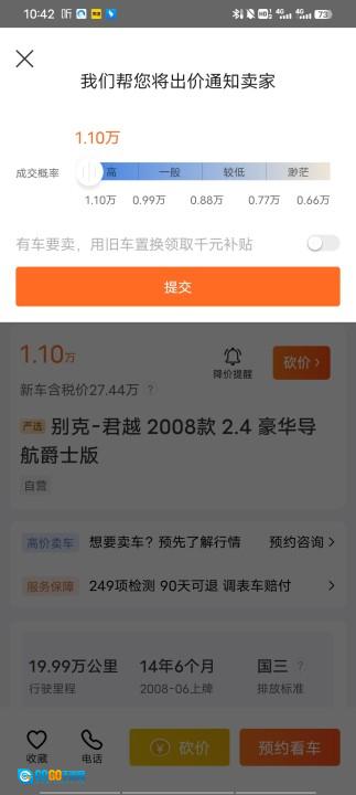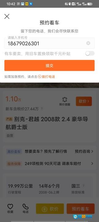 6、用户还能直接点击“预约看车”,接着点击下方加急预约的黄色“打电话”按钮,主动致电卖家,与其商议价格。