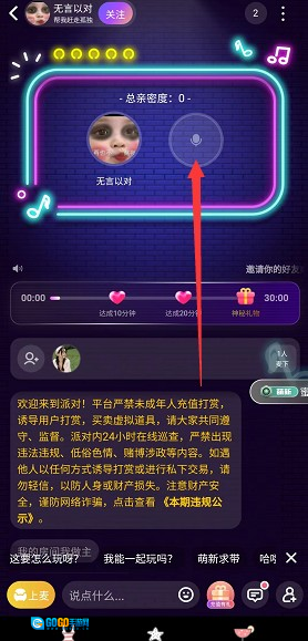 4、进入房间之后可以先听声音是否喜欢,喜欢的话,点击上方的那个【麦克风】,就可以直接上麦和主播聊天了。