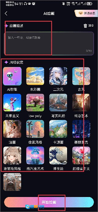 2、进入AI绘画界面后,在绘画描述中输入一句话,然后再下方选择风格设定,选择完成后点击开始绘画
