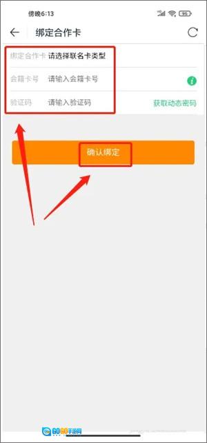 5、进入绑定合作卡页面,挑选联名卡类型,填入会籍卡号与验证码,然后点击【确认绑定】按钮。