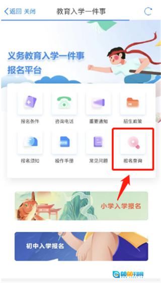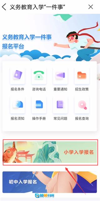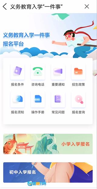 (1)打开首页,点击“义务教育入学一件事”报名平台,点击平台上方排列的功能按钮,即可查阅报名条件、咨询电话等相关信息。