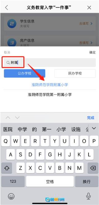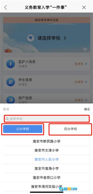 首先进行第一步,即选择学校。学校类型分为公办与民办这两种,系统支持对学校名称进行模糊搜索。当选中想要报名的学校后,点击该页面右上角的‘确认’按钮即可。