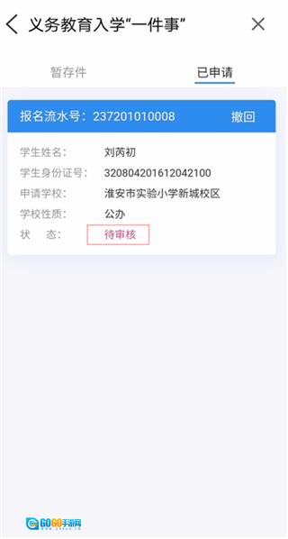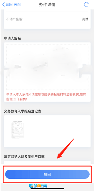(8)待审核件撤回操作:处于待审核状态的办件,可点击查阅表单填写内容。若发现填报信息有误或有其他需要修改的情况,可通过点击页面底部的“撤回”按钮,撤回已提交的申请(需注意,仅限于报名截止日之前进行撤回和再次提交。若撤回后更改报名学校,相应的报名流水号也会随之调整!)
