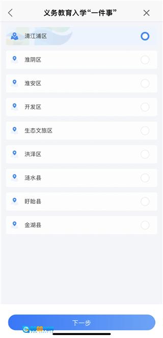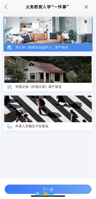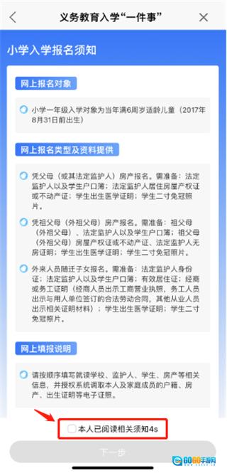 (4)确认信息准确无误后,点击“下一步”。接着选择报名学校所在的区划,再次点击“下一步”,随后选择报名类型,点击“下一步”,即可进入报名流程。(此文档以“凭父母(或其法定监护人)房产报名”作为示例,另外两种报名类型操作与之类似。)