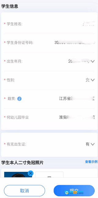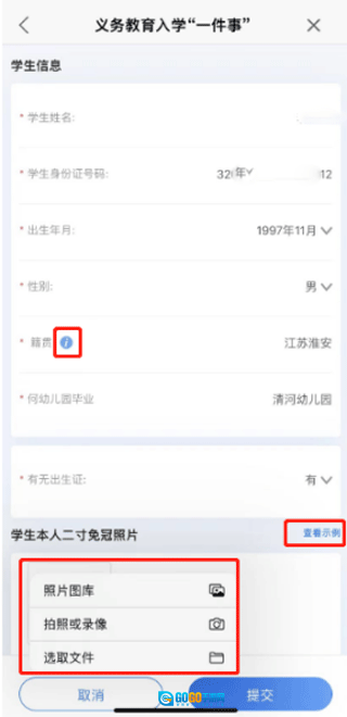 第三步,进行学生信息录入。在图6中,点击学生信息后的“去填写”按钮,即可进入学生信息填报页面。在此页面,需输入并确认以下学生信息:学生姓名、学生身份证号码。其中,出生年月以及性别会依据身份证号自动填充。籍贯信息填写时,可点击蓝色图标查看示例。此外,还需填写何幼儿园毕业、有无出生证(默认且必须选择“有”方可进行网上申报,若没有出生医学证明则需线下报名)。同时,要拍摄或上传学生本人二寸免冠照片,照片底色为蓝底或白底,大小限制在3M以内,且图片必须清晰。完成上述操作后,点击提交,即完成学生信息录入。