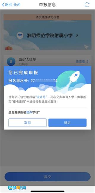 (6)报名成功后,系统将生成一个报名流水号,务必牢记此报名流水号,以供审核通过后线下报到(面试)时使用。同时,还能通过“首页 - 报名查询”入口查看已申报的办件情况。系统会依据当前学生的报名状况,提示是否继续报名。若点击“是”,即可继续报名其他性质的学校;若点击“取消”,则关闭提示。