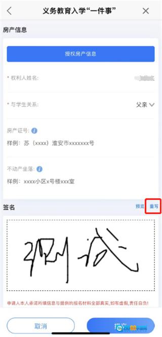 第四步:进行房产信息录入。在图6中,点击房产信息后的“去填写”,随即进入房产信息填报页面。在此页面,需输入并确认权利人、与学生的关系,以及房产证号(若不清楚填写规范,可点击蓝色图标查看示例。对于本地乡镇农村户口家庭,房产证号处应填写建设许可证、土地证或宅基证编号),还有不动产坐落地址(同样可点击蓝色图标查看示例)。此外,系统提供便捷功能,点击“授权房产信息”按钮,即可自动获取房产信息,无需手动填写(若有多套房产,务必选择对应学区的那套房产)。完成上述操作后,在页面底部完成签名(若需重新签名,点击‘重写’按钮即可),最后点击提交,至此完成房产信息录入。