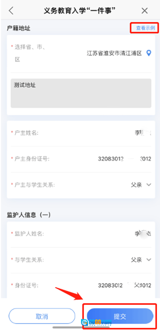 第二步,进行监护人信息录入。在图6里,点击监护人信息后的“去填写”按钮,随即进入监护人信息填报页面。在此页面,需输入并确认户籍地址(若不清楚如何填写,可点击右上角“查看示例”来明确填写内容)、户主姓名、户主身份证号、户主与学生的关系,还有监护人信息(一)以及监护人信息(二)的姓名、身份证号码、工作单位、手机号码等相关信息。全部信息录入完毕后,点击提交,至此完成监护人信息录入。